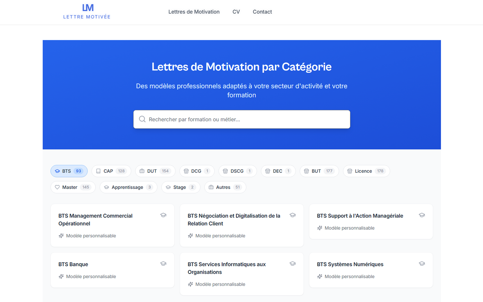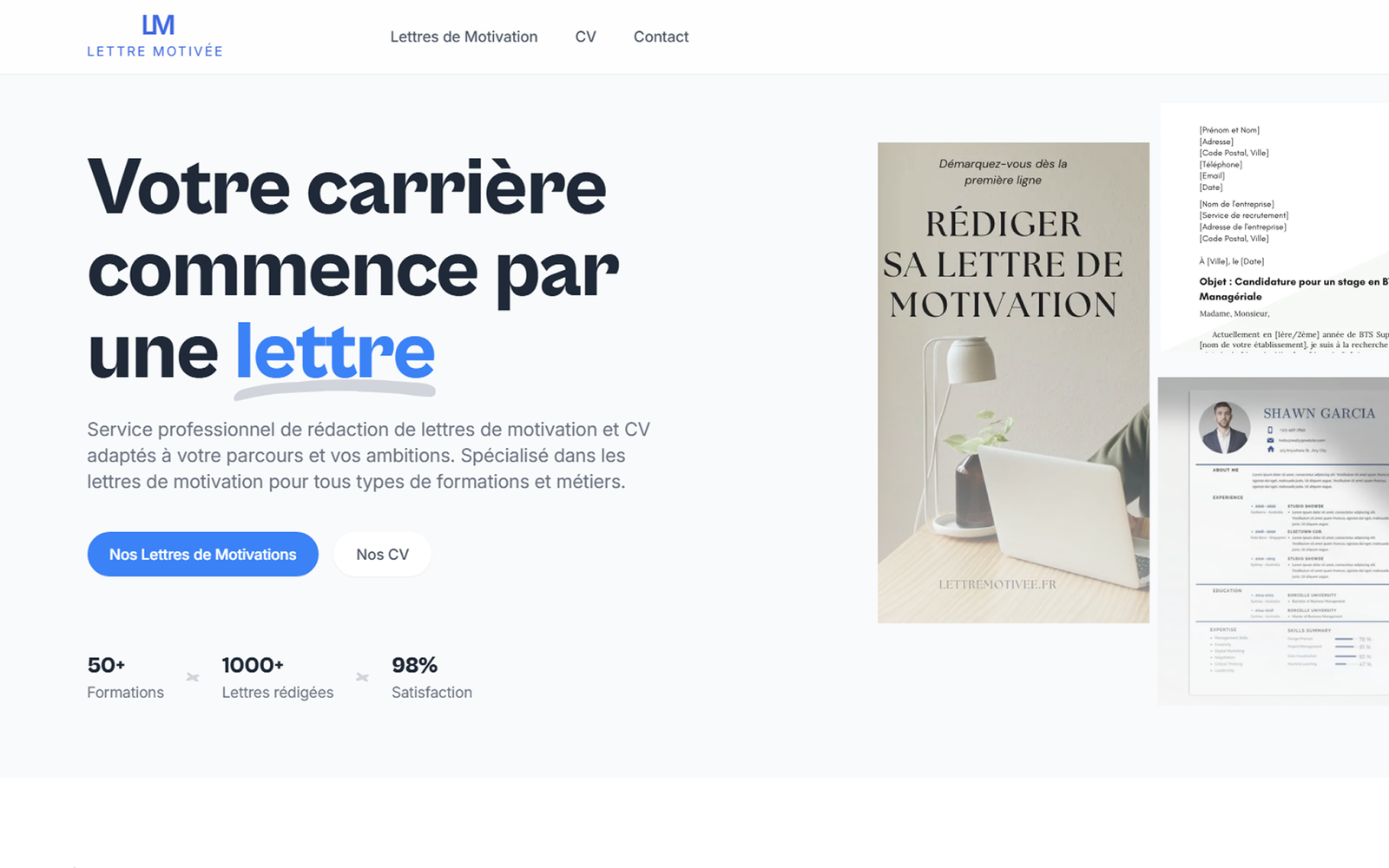 Pour le projet Lettre Motivée, nous avons conçu un site web permettant aux utilisateurs de créer facilement leur lettre de motivation et leur CV en ligne. L’objectif était de proposer une plateforme simple, intuitive et accessible, adaptée aussi bien aux étudiants qu’aux professionnels.